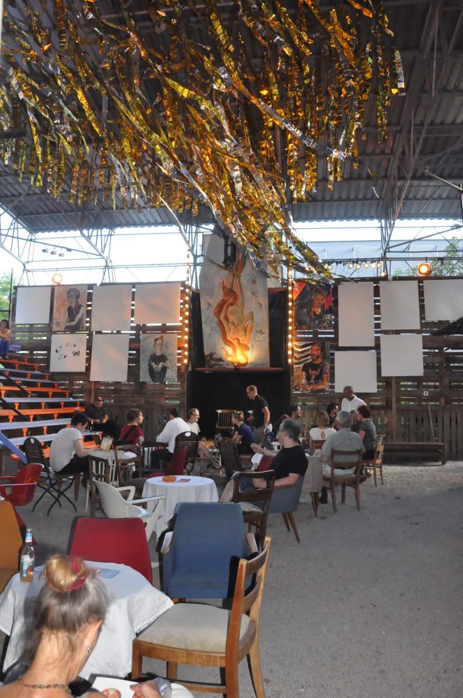 Im Festivalcafé spielt Livemusik. Dekoriert hat es Christopher Haley Simpson mit seinen Gemälden und einem Augenzwinkern: Eines der Bilder hängt aus aktuellem Anlass auf Baselitz anspielend verkehrt herum.