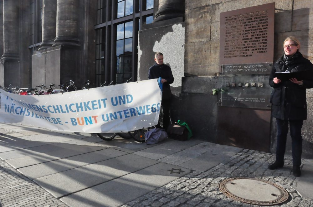 Am Freitag vor dem diesjährigen 13. Februar haben rund 50 Menschen der aus Dresden deportierten Juden gedacht. An der Gedenktafel am Eingang zum Bahnhof Dresden-Neustadt sprach um 14.30 Uhr Frauke Fähndrich, die Pfarrerin der Dreikönigskirche über den hiesigen Startpunkt der Deportationen in die Konzentrationslager Riga, Theresienstadt und Auschwitz-Birkenau. „Sammelplatz war der damalige Leipziger Güterbahnhof.“ Der Bombenangriff am 13. Februar 1945 verhinderte die für den 16. Februar geplante Deportation der letzten verbliebenen Dresdner Juden. Das Denkmal mahne die Lebenden, wie die christliche Pfarrerin betonte, „wachsam zu bleiben und gut für die Zukunft zu sorgen. Dies ist jetzt in Dresden nötiger denn je.“ Solotrompeter Ludwig Kowollik intonierte traditionelle jüdische Melodien, anschließend wurden zahlreiche Blumen niedergelegt. (ug)