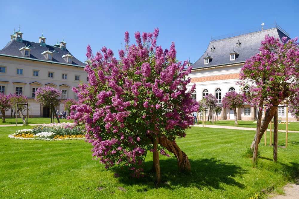 Einen farb- und duftgewaltigen Pfingstgruß senden die über einhundert Jahre alten Fliederbäume im Fliederhof aus. Sie stehen aktuell in üppiger Blüte: Die stark duftenden Blütenstände der zart violetten Blüten bedecken die gesamten Kronenoberflächen. Auch die im April neu gepflanzten 15 Fliederbäumchen zeigen zaghaft ihre zukünftige Pracht.