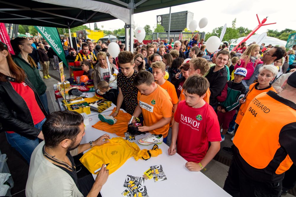 Neben dem Turnier gibt es aber auch außerhalb des Rasens einiges zu entdecken. Direkt am Eingang kann man hinter dem Stand der Sächsischen Zeitung einer Stadionführung folgen. Sie zeigt unter anderm die Torjägerkanone des Schützenkönigs der Bundesliga oder den FDGB-Pokal aus nächster Nähe.