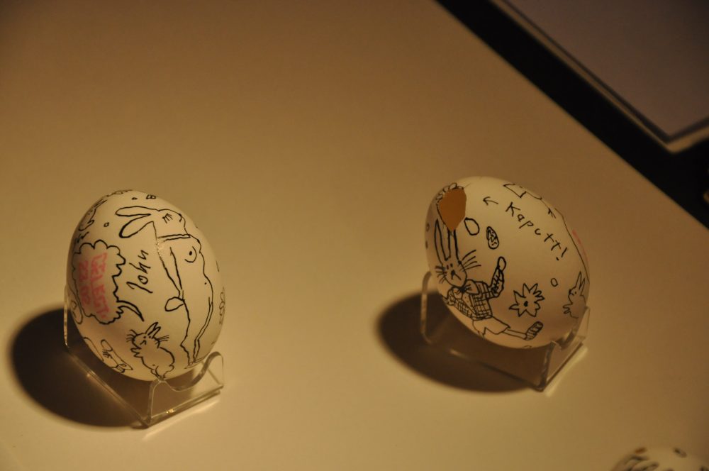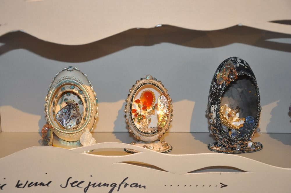 Die Palette der ausgestellten 35 Sträuße mit Osterschmuck reicht von Farbe und Wachs über Drahtgebinde, Glitzer, Stroh und Naturmaterial bis hin zu Edelsteinen.  Letztere finden sich in einer Sonderschau zum Eier-Theater der Katharina Benkert. Sie hat neben Theaterthemen auch den Osterspaziergang Goethes thematisiert und in kunstvollen Ei-Bearbeitungen inszeniert.