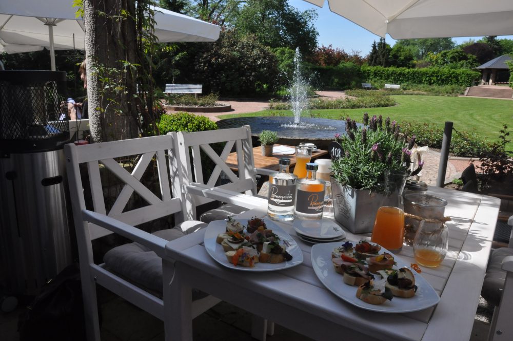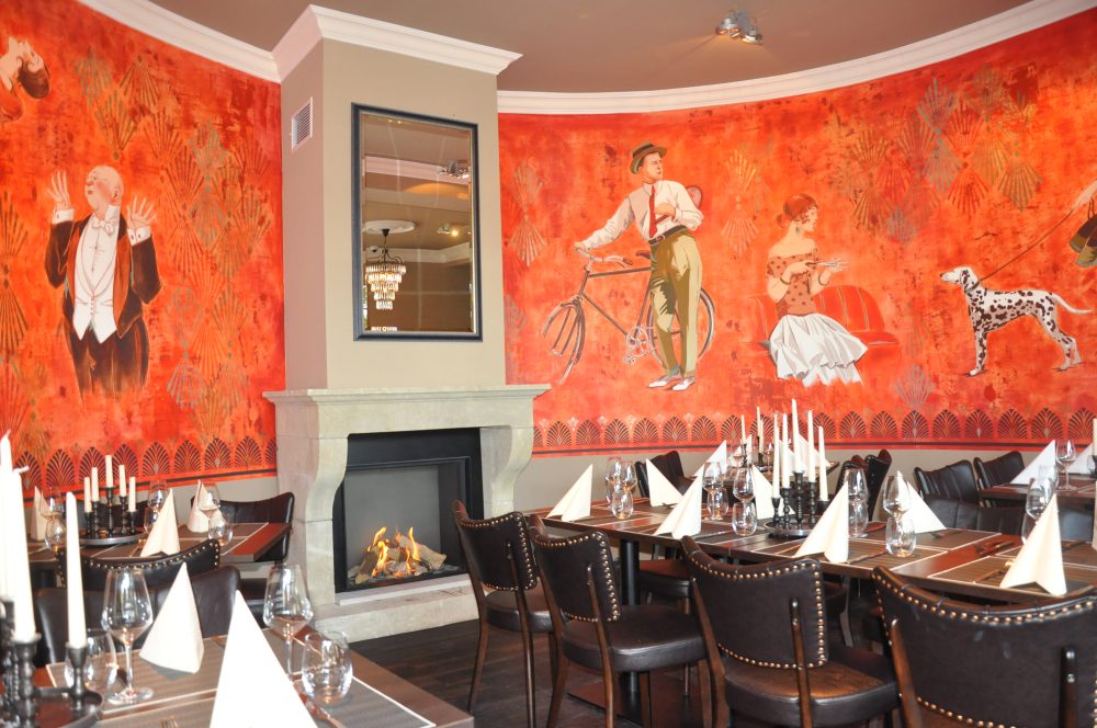 Und das ist zu sehen: Antik anmutende Holzstühle, Ziegelwände und Bodenfliesen, ein handgefertigter Zinntresen, eine elegante Auftragswandmalerei im Stil der Endzwanziger, eine Spielecke mit Fußbodenheizung, ein Kamin mit Echtfeuer, Tisch-Feuerschalen, ein Salon für separate Feiergruppen im Obergeschoss, Teakholztafeln im vorhangüberdachten Zelt, Strandkörbe mit Elbblick und Toiletten im gehobenen Stil. Italienischen Schick kann die Mafia.