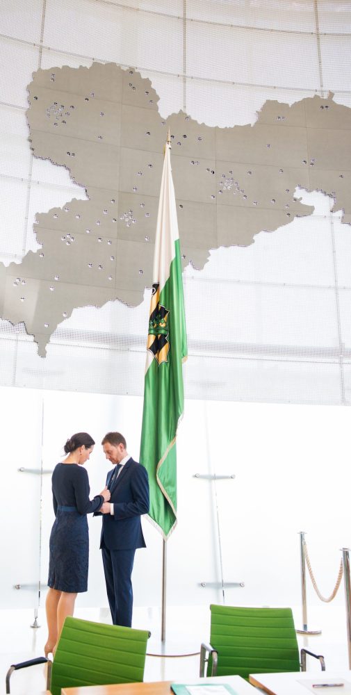 Der neue s?chsische Ministerpr?sident Michael Kretschmer mit seiner Lebensgef?hrtin Annett Hofmann am Mittwoch (13.12.2017) in einem stillem Moment zwischen seiner Vereidigung und seiner ersten Regierungserkl?rung im S?chsischem Landtag in Dresden.