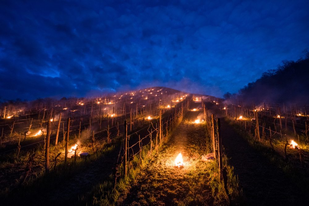 Unz?hlige kleine Feuer erleuchten am Donnerstagmorgen (20.04.2017) einen Weinberg am Klausenberg in Mei?en. Mit der ungew?hnlichen wie aufwendigen Schutzma?nahme will das Weingut Schuh den bereits am weitesten ausgetriebenen Dunkelfelder vor Frost zu sch?tzen. Hier droht sonst ein Totalausfall.