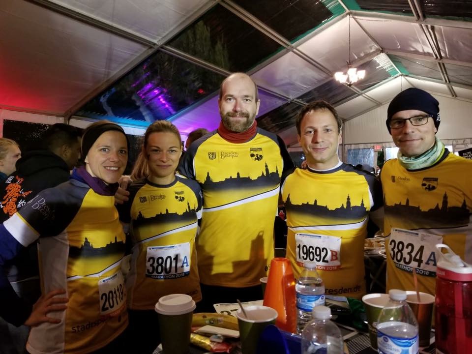 Am 21.10.2017 kam dann das Highlight – der „Nationwide Children’s Hospital Marathon“ in Columbus, Ohio. Eines der größten Laufevents der Stadt mit über 19.000 Startern. Am Renntag selbst hatten wir als Läufer des Städtepartner-Austauschs das unglaubliche Glück, Zugang zum VIP-Zelt und den damit verbundenen Annehmlichkeiten zu haben. Der Start wurde mit Nationalhymne und Eröffnungsfeuerwerk in der Morgendämmerung zelebriert, die Stimmung an der Strecke war unfassbar. Es gab keinen freien Zentimeter, weil man wirklich überall angefeuert und angetrieben wurde und aller 500 Meter eine andere Band oder ein anderer DJ für Unterhaltung sorgte. Das Besondere an diesem Lauf: Der Marathon ist ein Benefiz-Lauf für das örtliche Krankenhaus „Nationwide Children Hospital“.  Aus diesem Grund wird jede Meile  von einem Kind aus dem Kinderkrankenhaus präsentiert bzw. waren diese sogar zum Teil vor Ort und haben herzlich gelacht, weil man für einen Handschlag oder für ein gemeinsames Foto stehen geblieben ist. Gänsehaut pur – wenn man bedenkt, dass es an diesem Tag sehr kalt war (zum Start waren es lediglich 2 Grad) und sie trotzdem durchgehalten haben, um ihr „Highfive“ zu ergattern.  Unsere Dresdner Lauftruppe umfasste 4 Marathonis und 1 Halbmarathonis und alle waren im Ziel mit den eigenen Leistungen sehr zufrieden. Und der Tenor zu diesem Event war einfach „Unvergesslich!“