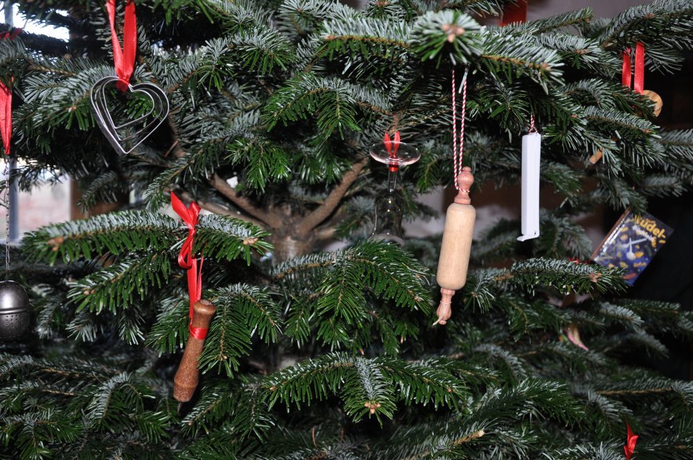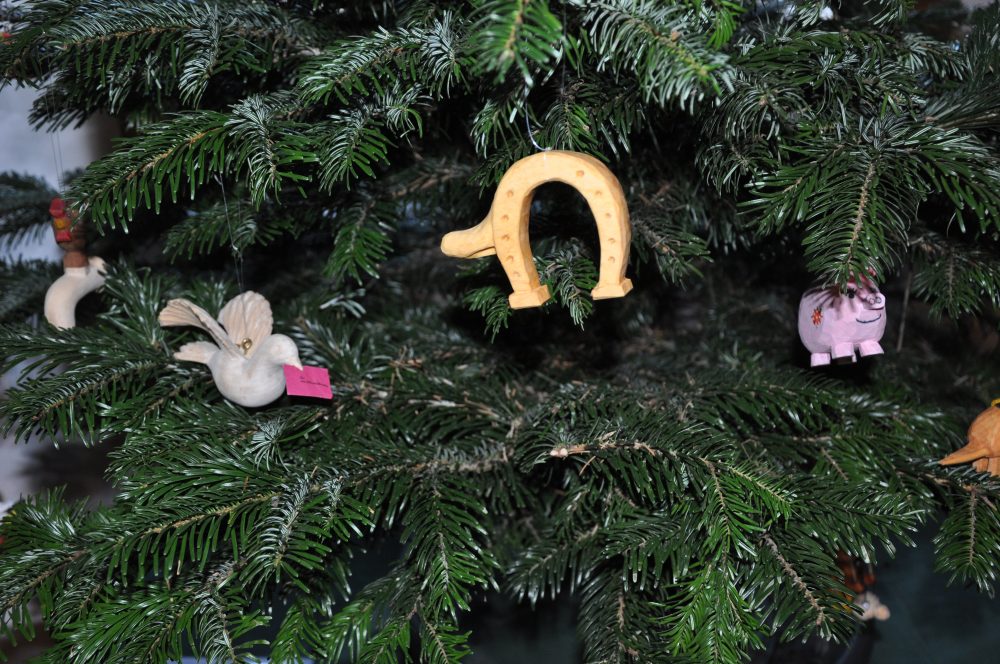 Ideen holt sich das herandrängende Publikum auch an den 35 unterschiedlich geschmückten Bäumen. Die meisten Anhängsel trägt das Exemplar im Foyer: exakt 2.478 traditionelle Sterne. Zu Sternen wurden auch leere Kaffeepads; aus Papier sind Christbaumkugeln geformt. Überhaupt steht Upcycling hoch im Kurs. Da kommen Papp-, Ton- und Stoffreste wieder zu Ehren, da wird geknetet, geschnitzt und gemalt, was das Zeug hält. Am lustigen Tiereraten-Baum sind Brillenschlange, Lackaffe, Bücherwurm und Hufeisennase zu finden.