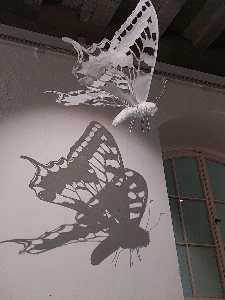 Schon auf halber Treppe vor dem eigentlichen Ausstellungsraum grüßt das Nachtfalterkomitee – acht sehr große Insektenkokons aus Pappmaché der Künstlerin Sabine Emmerich. Die Schau selbst ist in drei Abschnitte gegliedert. Im ersten sind farbige Insektenporträts zum Beispiel von Gottesanbeterin, Libelle, Wespe und Heuschrecke zu sehen – wunderschöne Makroaufnahmen des Fotografen Thorben Danke, die sagen wollen „Schau mir in die Augen“. Hier finden sich auch sechs sehr detailgetreue Insektenmodelle im Maßstab 1:11 bis 1:20 der Künstler Julia Stoes und Detlev Gregorczyk. Wer ihre Maikäfer im Moment des Abflugs oder die bunte Schmetterlingsraupe sieht, wird diese Tiere in natura mit anderen Augen betrachten. „Das ist genau der Anspruch von ’Inuversumm’, sagt Kurator Dr. Matthias Nuß. „Dass wir Insekten künftig bewusster wahrnehmen.“ Stichwort Bewusstsein: Die Forschung geht inzwischen davon aus, dass Insekten über eine einfache Form des Bewusstseins verfügen.