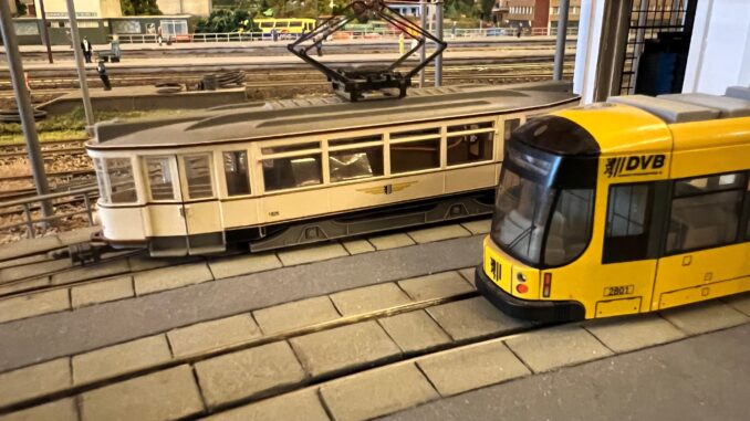 Die Modellbahnausstellung findet an den Wochenenden 15./16. und 22./23. November 2025 sowie dem dazwischen liegenden Buß- und Bettag (19. November 2025) am Emerich-Ambros-Ufer 52 in 01159 Dresden von 10 bis 17 Uhr statt. Neben der im Bau befindlichen neuen Nossener Brücke mit Straßenbahnverkehr (Teilbereich im Modell dargestellt) können auf der 9 m² großen TTAnlage auch die ersten digital verkehrenden Züge bewundert werden. Vor dem Herzstück unseres Clubs, der 60 m² großen H0-Anlage, verkehren auf einem Rundkurs Straßenbahnfahrzeuge der DVB aus verschie-denen Epochen. Zwei Kleinanlagen in TT vervollständigen das Thema Straßenbahn.